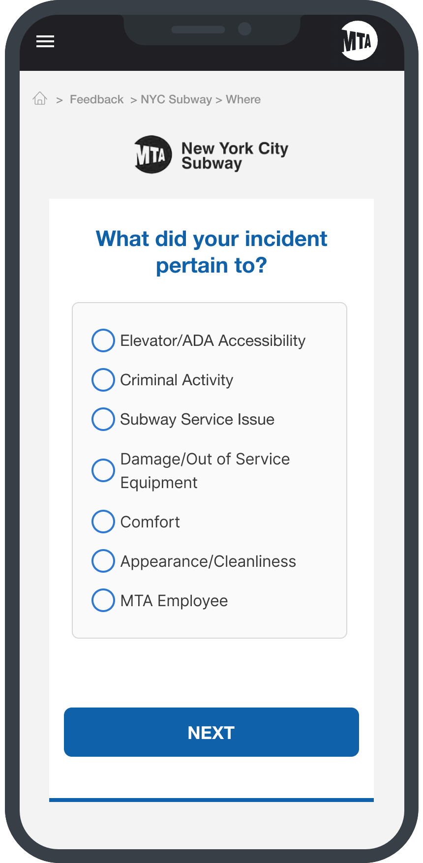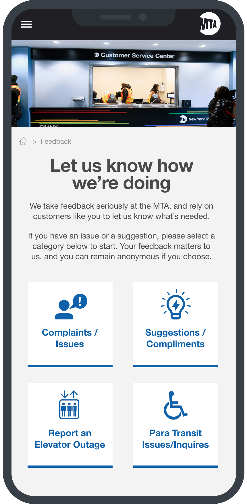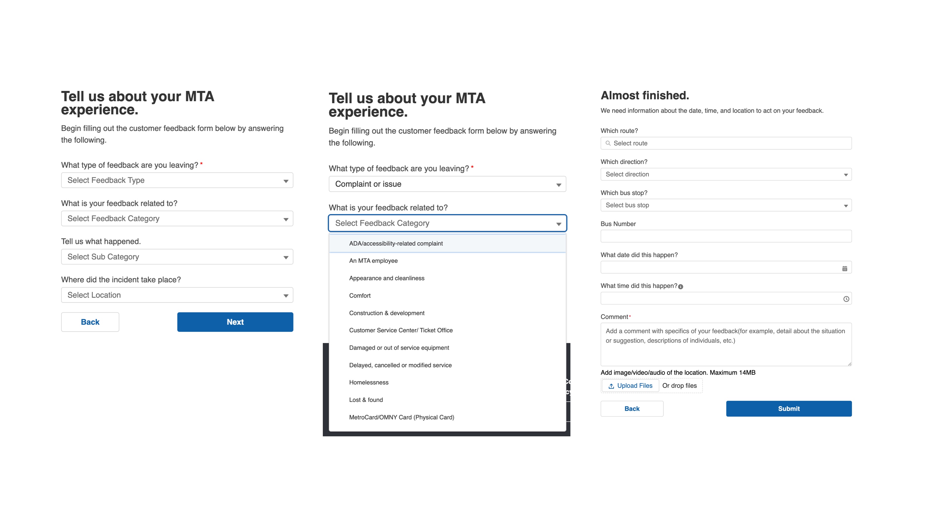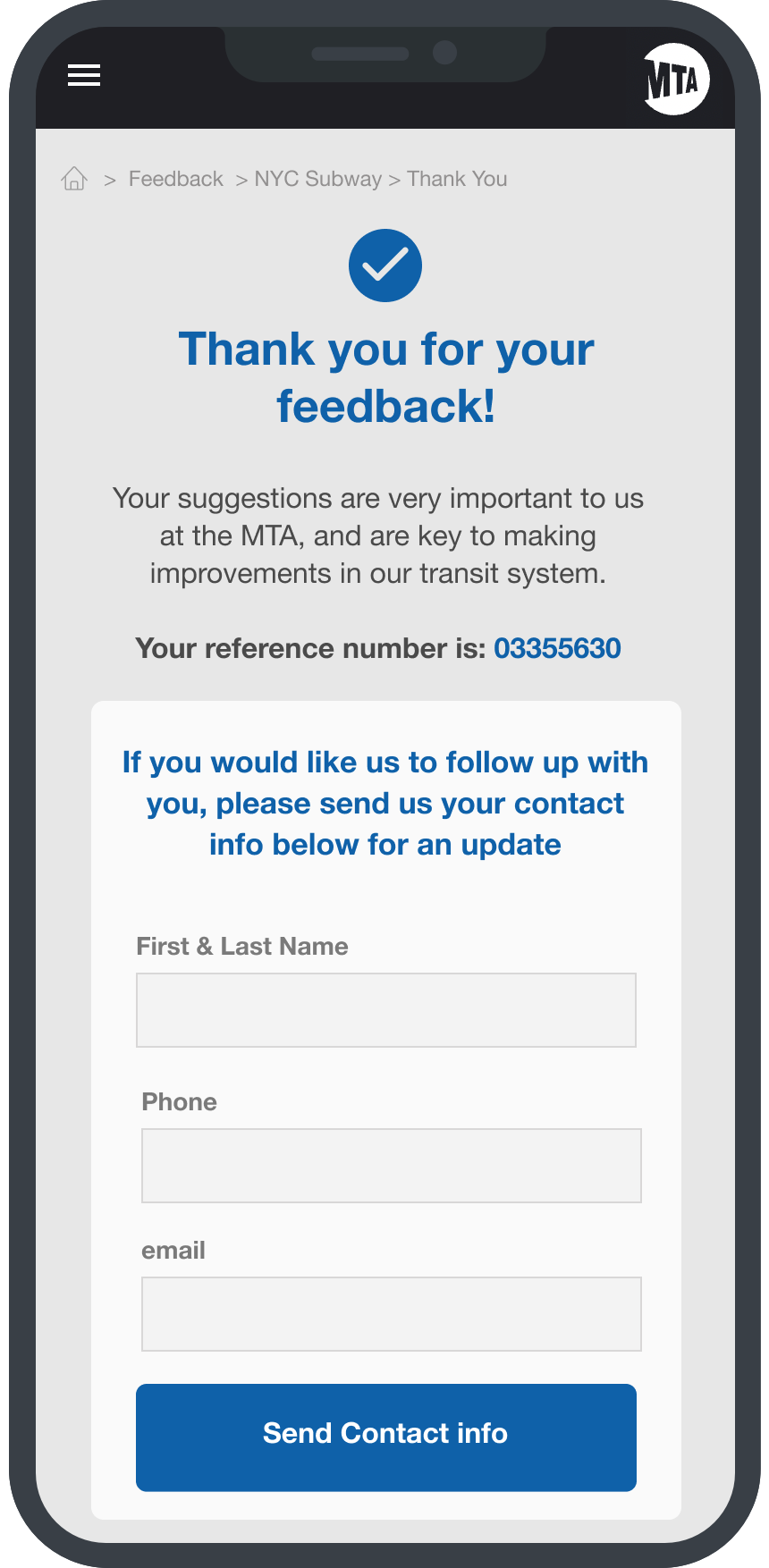 The current feedback collection process at MTA is inefficient and lacks effective user engagement. The existing feedback form, which is the only channel for collecting feedback across all MTA services, presents significant challenges for users to submit their input in a comprehensive manner. The form's extensive number of fields and dropdown menus makes it cumbersome and time-consuming for users to complete, resulting in a low response rate and limited feedback data. This hinders MTA's ability to gather valuable insights and make informed decisions to improve the overall service quality and user experience.