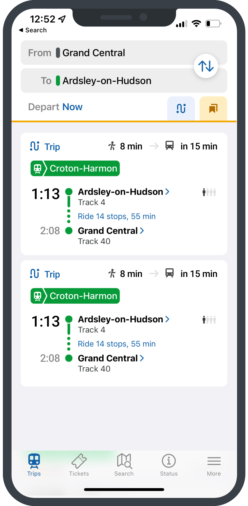 The current search results display an overwhelming list of trains with an infinite scroll, significantly slowing the app's performance. Identifying a user's active trip to view journey details has proven difficult, as there is no clear visual distinction between past and future scheduled trains. This lack of clarity makes it challenging for regular commuters to efficiently find and book their routine train services in the extensive list of options.