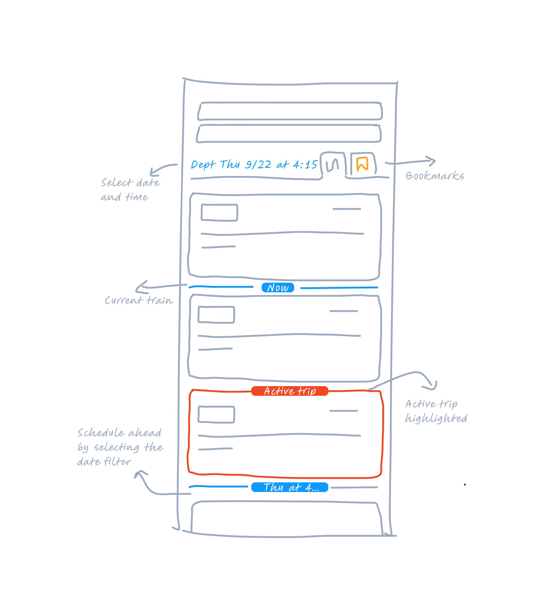 To address the issues with the search results and user experience, I introduced a date filter bar with a bookmark tab, as well as a visual "Now" and "Date" separator line based on the current time. This helps provide users with a clearer distinction between past, present, and future train schedules.